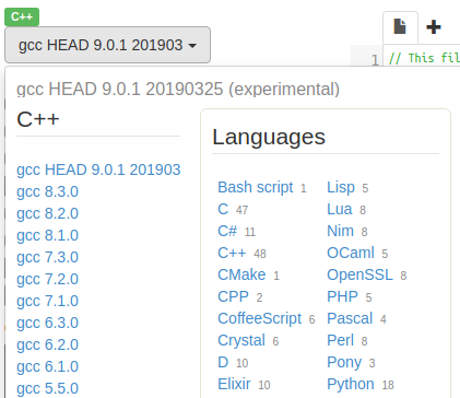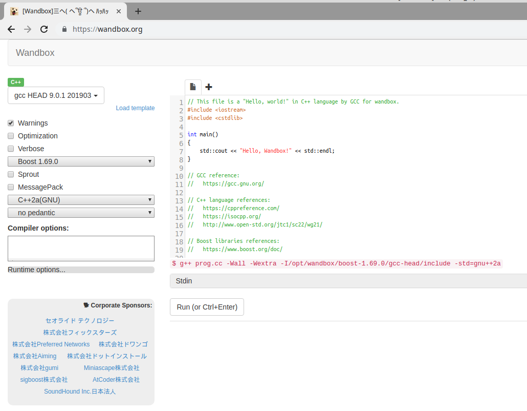 O Wandbox vem, na primeira vez que você usa, configurado para ser usado com a linguagem C++.