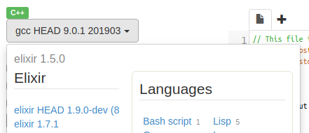 Lá no canto superior esquerdo, clique em “gcc HEAD 9.0.1 201903” e, dentre as opções que aparecem, clique em “Elixir” (segunda coluna, mais ou menos no meio) e depois em “Elixir 1.7.1” (primeira coluna, quase no topo). Veja as duas imagens abaixo.